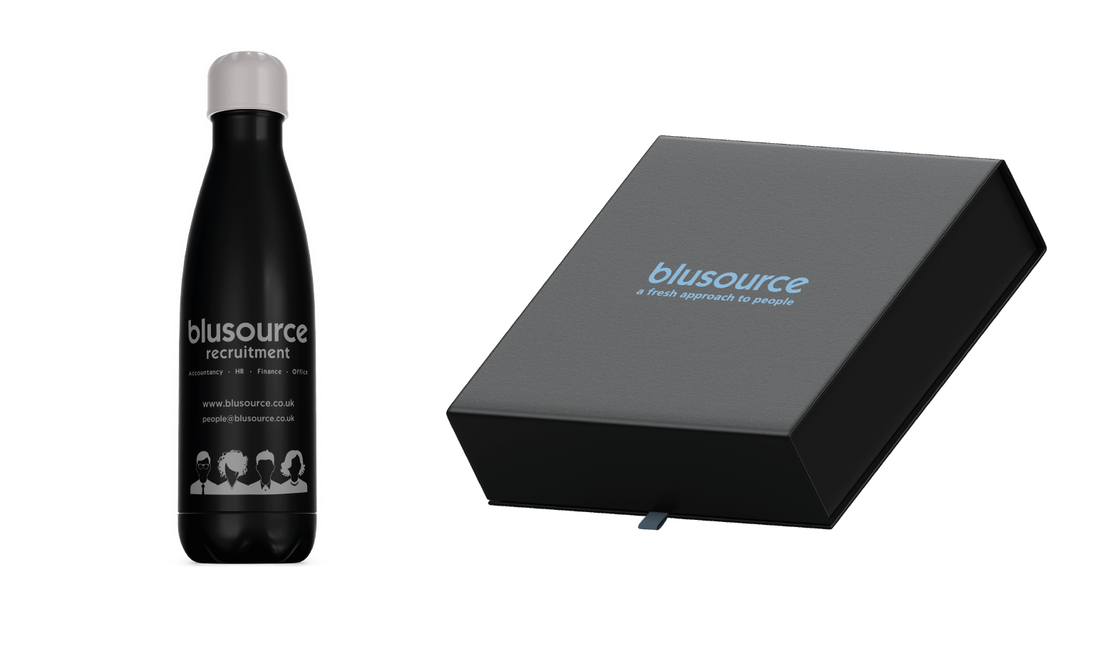 The gift box design included subtle branded elements, placing the Blusource name within each company candidates join.